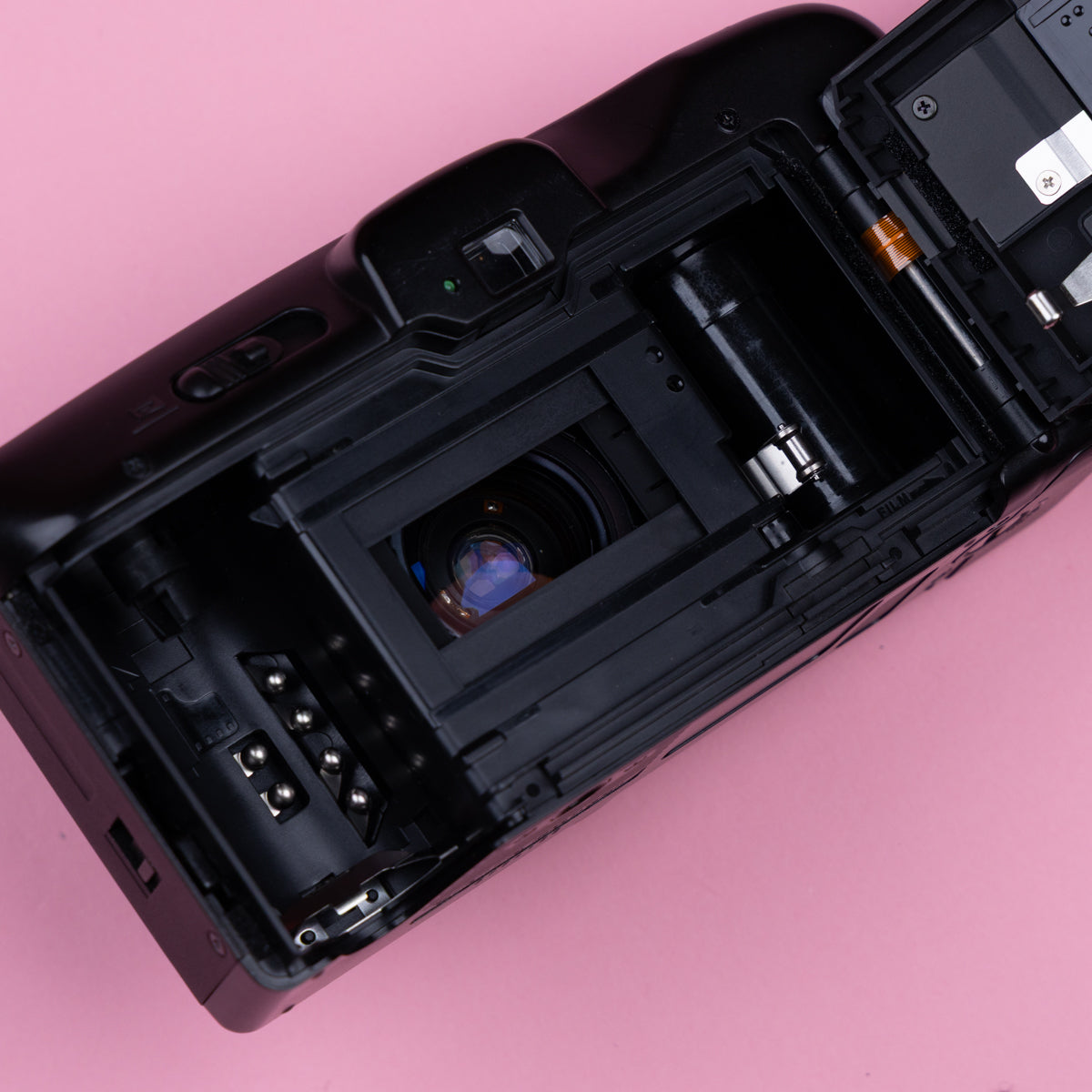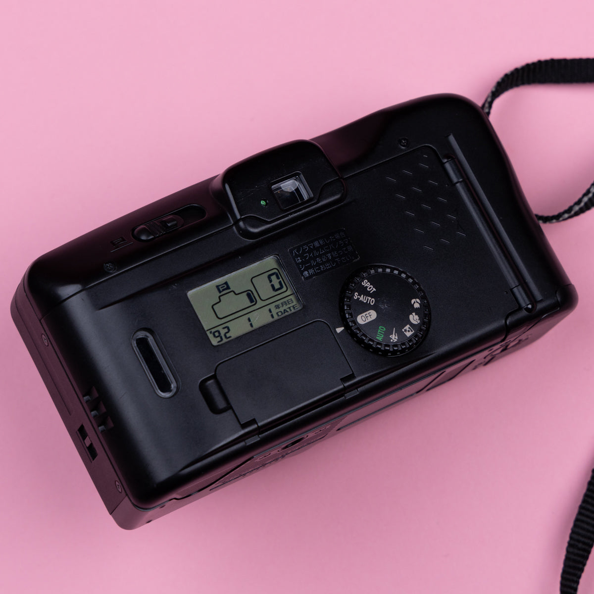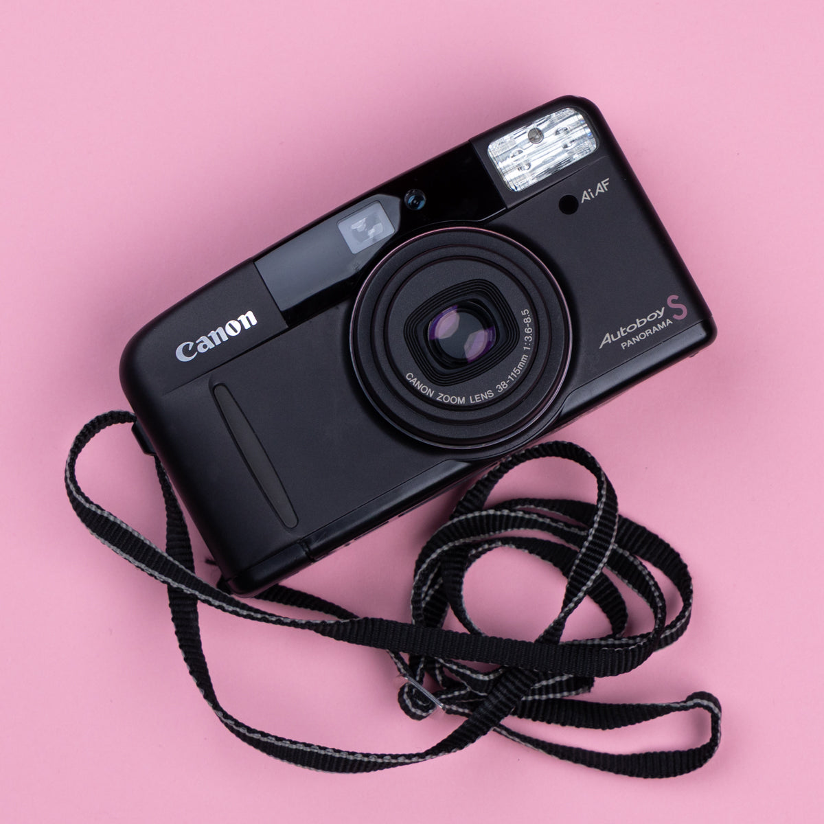 The Canon Autoboy S Panorama is a fully automatic 35mm point-and-shoot film camera known for its versatile zoom lens and dedicated panorama mode, making it popular with both beginners and experienced film enthusiasts.
