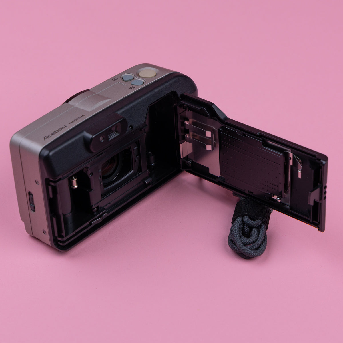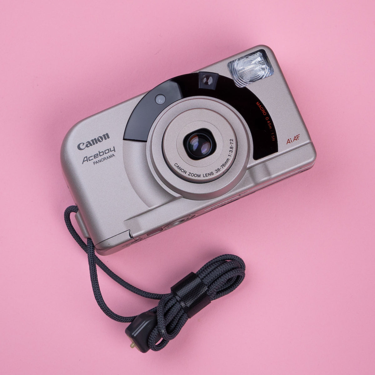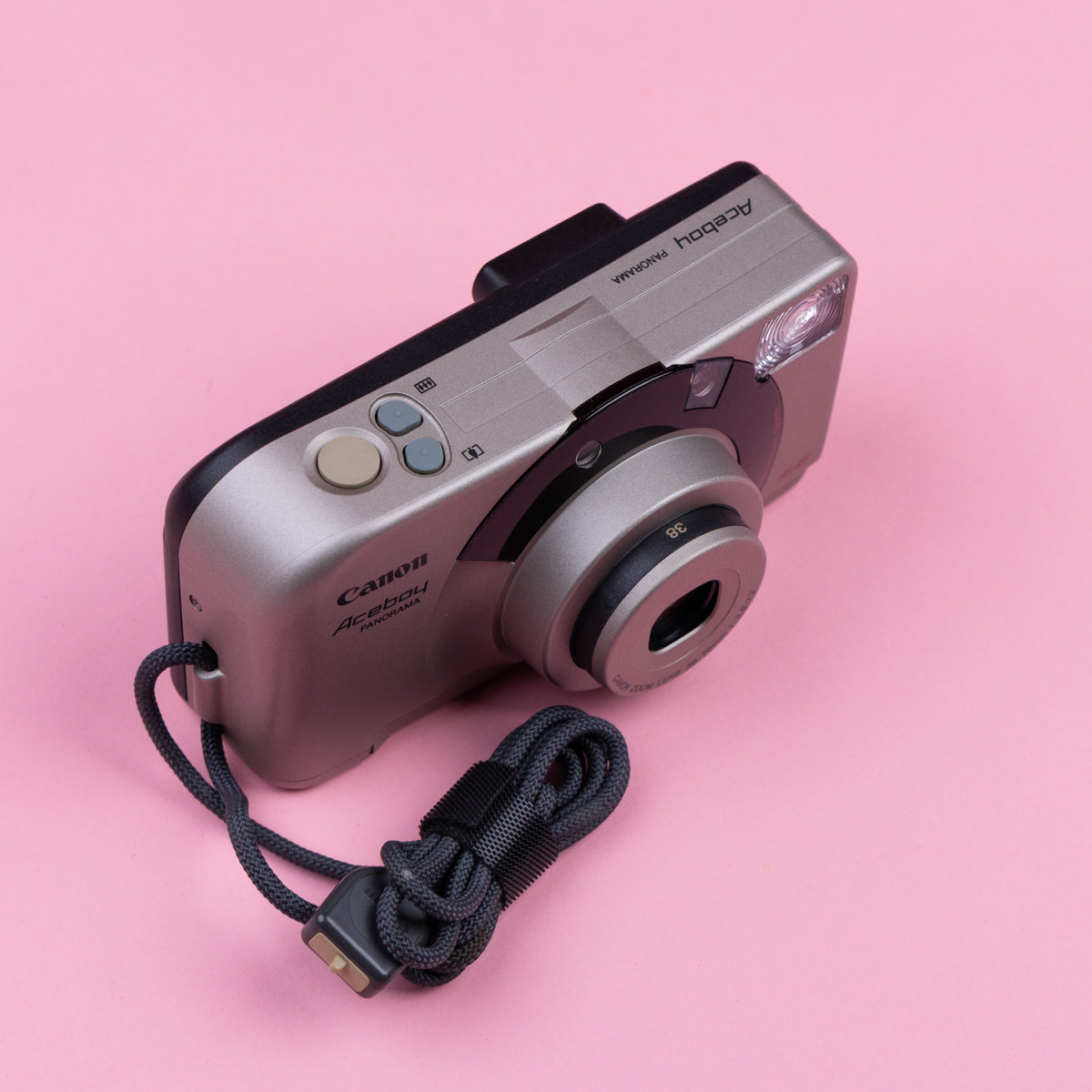 The Canon Aceboy Panorama is a 35mm compact point-and-shoot film camera with a 38-76mm f/3.8-7.2 zoom lens. It features AI-AF 3-point smart autofocus, a built-in flash, and a dedicated switch for panoramic or 13x36mm, shots. Released in the 1990s as a user-friendly, automatic camera, it is popular for its lightweight, stylish design and easy operation.