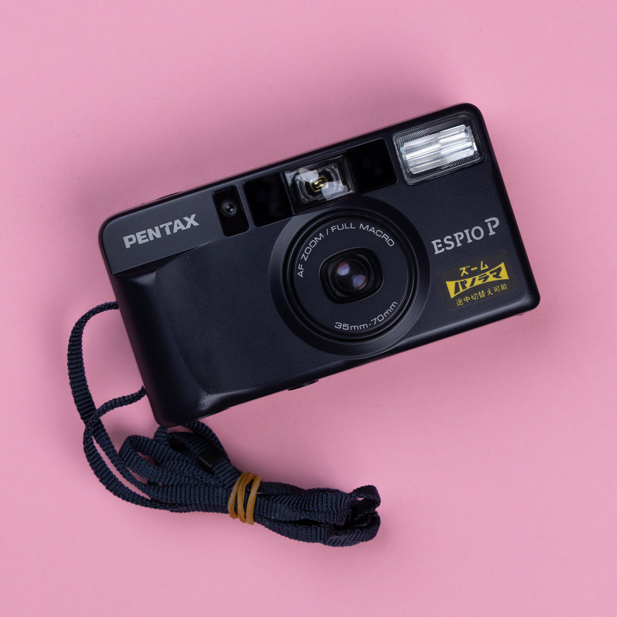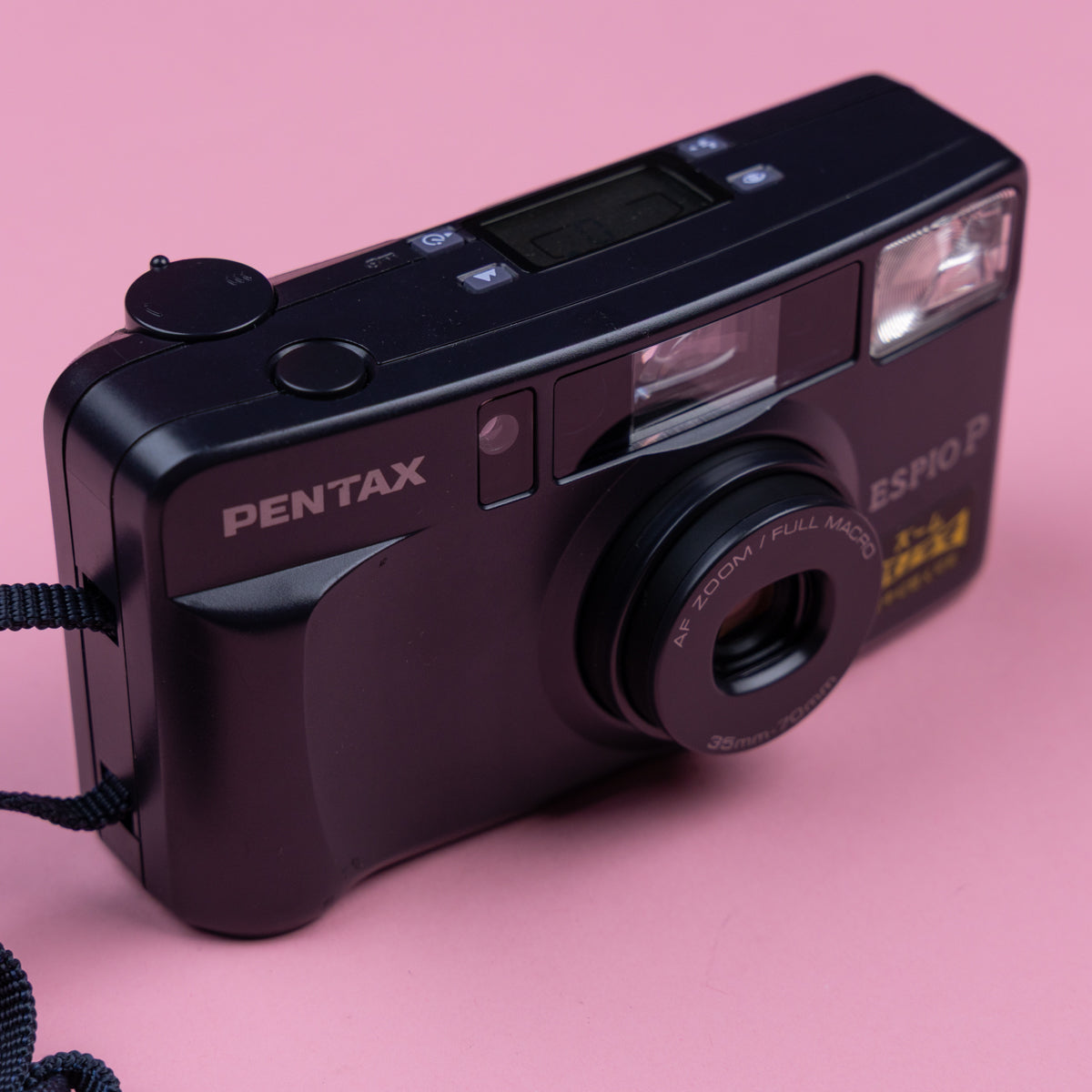 The Pentax Espio P (released 1994) is a compact 35mm point-and-shoot film camera featuring a 35-70mm power zoom lens, f/4.3-8.0 aperture, and active infrared autofocus. It offers fully automatic operation, including DX ISO coding (25-3200), auto-flash with multiple modes, and built-in flash, all powered by one CR123A battery. It is known for being a lightweight, reliable, and user-friendly camera with a 0.6m minimum focus distance.